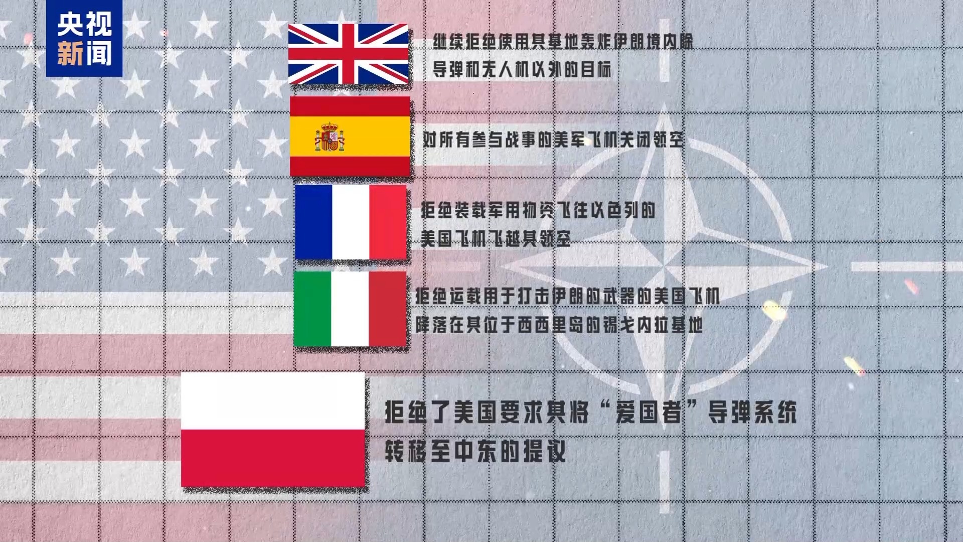 到了3月底,局势进一步升级。英国继续拒绝使用其基地轰炸伊朗境内除导弹和无人机以外的目标;西班牙对所有参与战事的美军飞机关闭领空;法国拒绝装载军用物资飞往以色列的美国飞机飞越其领空;意大利拒绝运载用于打击伊朗的武器的美国飞机降落在其位于西西里岛的锡戈内拉基地;波兰也拒绝了美国要求其将“爱国者”导弹系统转移至中东的提议。